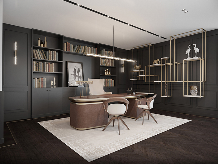 整個空間交織著現代的雅致和貴族氣質,提供與個人身份相符或者更高級別的商業化環境,以此增加附加價值。大量純銅與石材的鑲嵌工藝,皮革、木質、金屬的組合細節,使原本沉穩高雅的空間增添時尚感。